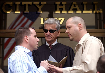 Gary left and Robert right, are legally married in Massachusetts by Justice of the Peace Michael Kuhn. Photo by Kyra Horvath