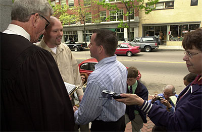 Bob's mom Carol Sapol holds a cell phone so that his grandfather can hear the service by Justice of the Peace Michael Kuhn . Photo by Toni Carolina