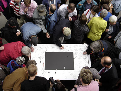 All the coupes who posed for the photo are asked to sign the matting of where the photograph will be placed. Once developed, the photo will be presented to the Massachusetts Legislature. Photo by Gary Halteman